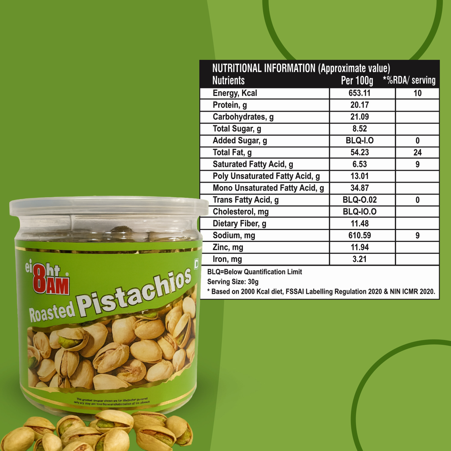 - Diabetics’ Delight: Having low-glycemic index, 8AM 8AM Roasted Pistachios help control blood sugar levels and is a super healhty snack that is diabetes-friendly.